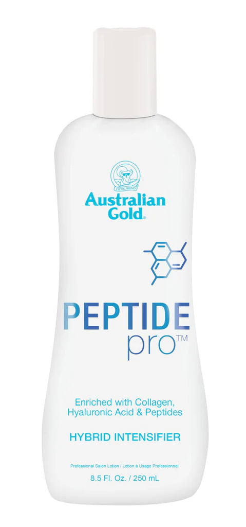 PEPTIDE PRO™ 250ml de Australian Gold es un intensificador del bronceado y antiedad híbrido 2 en 1 con estimuladores de melanina, péptidos, ácido hialurónico, vitamina A, E y B5 con alto poder antiedad.
