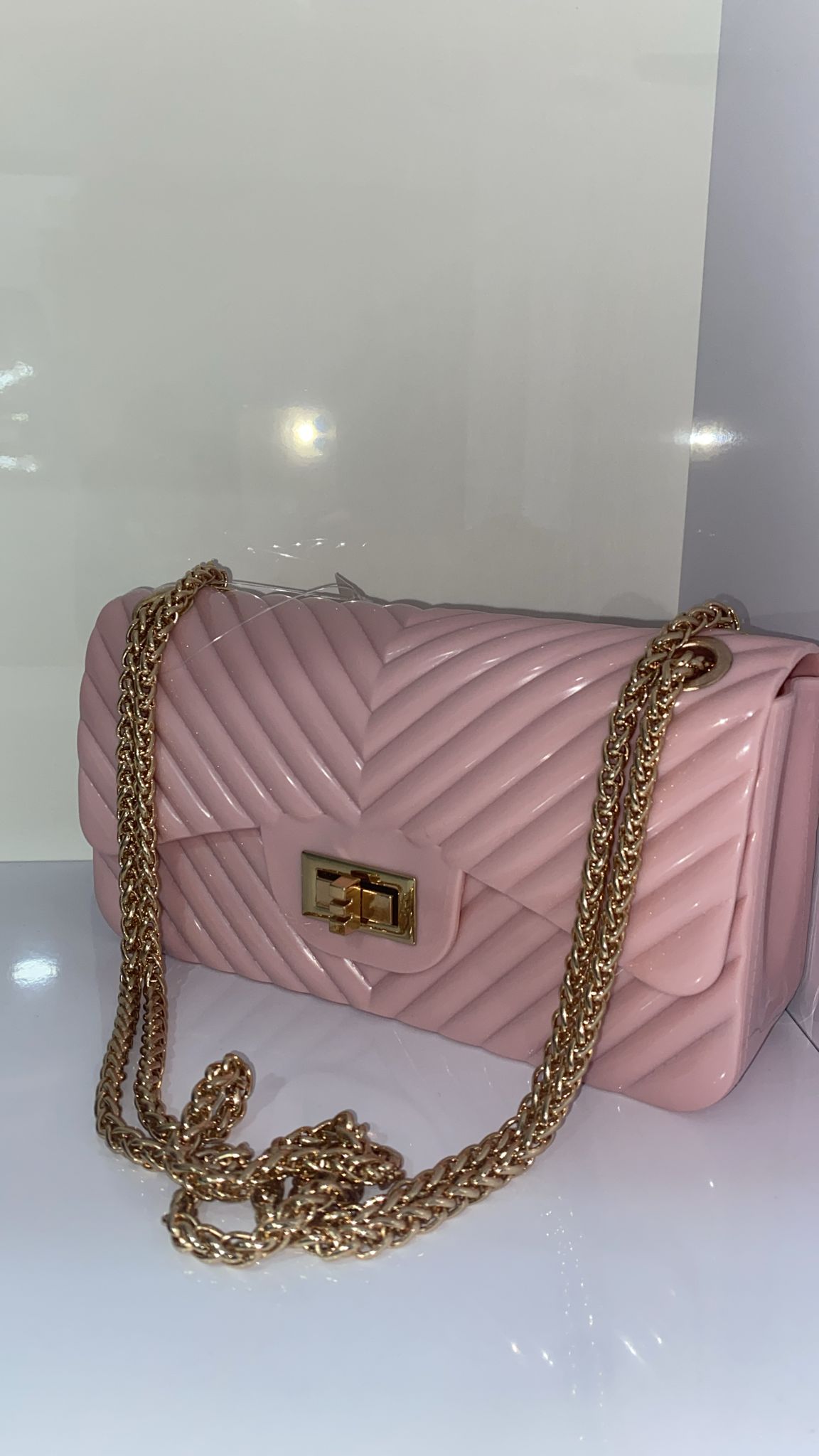 Bolso rosa de PVC con asas y cadena dorada – Estilo elegante y de alta calidad para tus necesidades diarias y fiesta